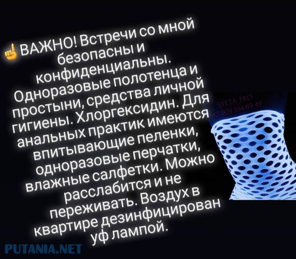 о себе: | ОБО МНЕ: Привет, меня зовут Света. Красивая и Опытная, настоящая индивидуалка! Со мной можно воплотить то, о чем с другими девушками ты даже обсудить стесняешься. ПРАЙС. Классика+оральный: Полчаса- 4000 руб. Час - 6000 руб. Есть МОБ.БАНК, но предпочитаю наличные. ---------------------------------------------------------------------------------------------------------- Обожаю мужские попки. СТРАПОН, ФИСТИНГ, ЛЕГКОЕ ДОМИНИРОВАНИЕ, СМЕНА РОЛЕЙ, ПЕРЕОДЕВАНИЕ МУЖЧИН В ЖЕНСКОЕ, ФИЗИЧЕСКОЕ И МОРАЛЬНОЕ ПОДЧИНЕНИЕ МНЕ. Все перечисленое 6 тыс час. ВАЖНО! Встречи со мной безопасны и конфиденциальны. Всегда в наличии всё необходимое: полотенца, простыни, средства личной гигиены. Хлоргексидин. Для анальных практик имеются впитывающие пеленки, одноразовые перчатки, влажные салфетки. Можно расслабиться и не переживать. -------------------------------------------------------------------------------------------------- FACECONTROL: Русские от 30 лет. Исключений нет! -------------------------------------------------------------------------------------------- КОНТАКТЫ: Предпочитаю общение в мессенджерах. Есть канал в телеграмме SVETAREAL2 -------------------------------------------------------------------------------------------------- P.S.: Мужчины с пузиком ван лав. P.S.S.: Люблю Герберы, Кустовые розы, мартини. |